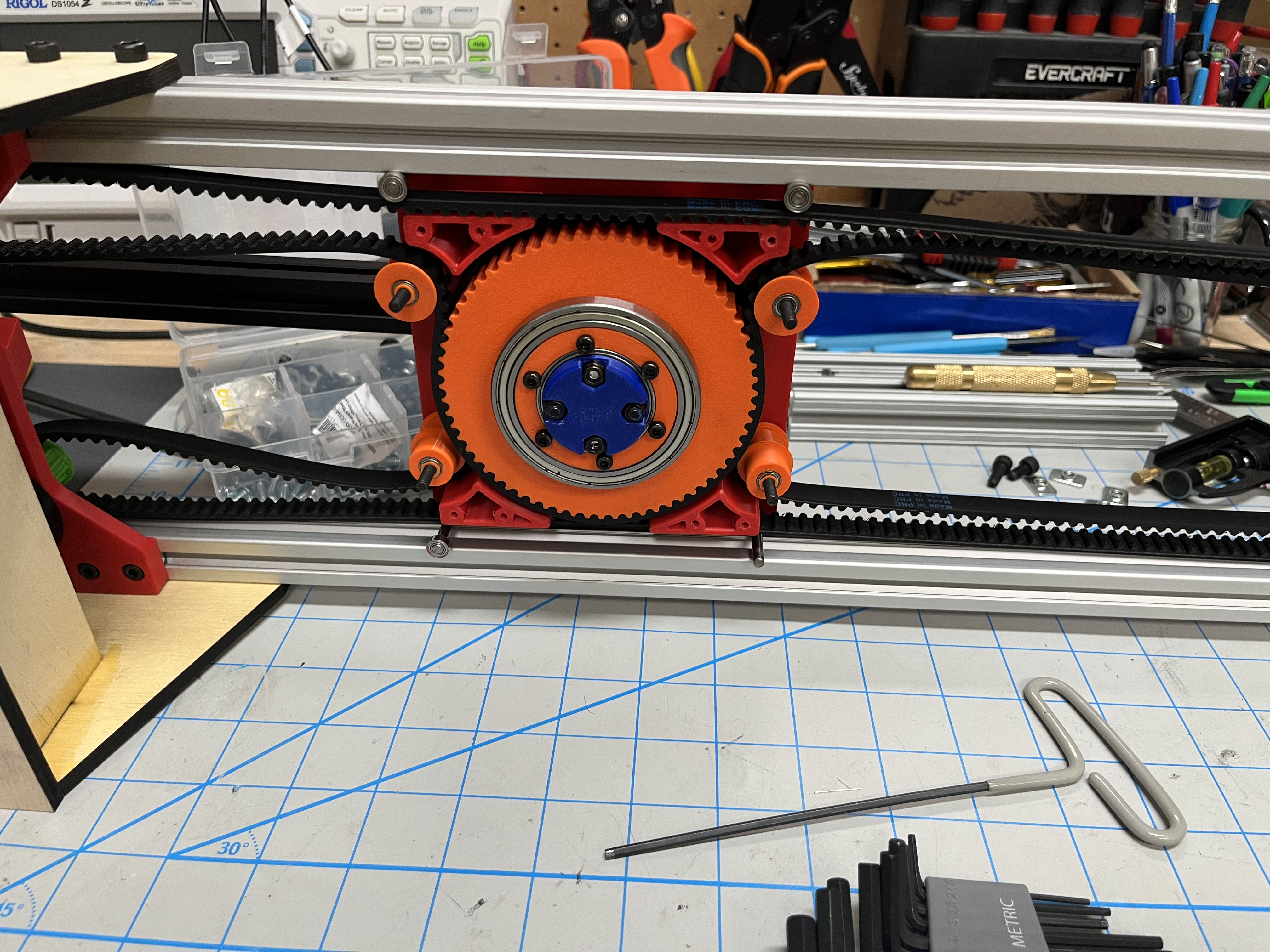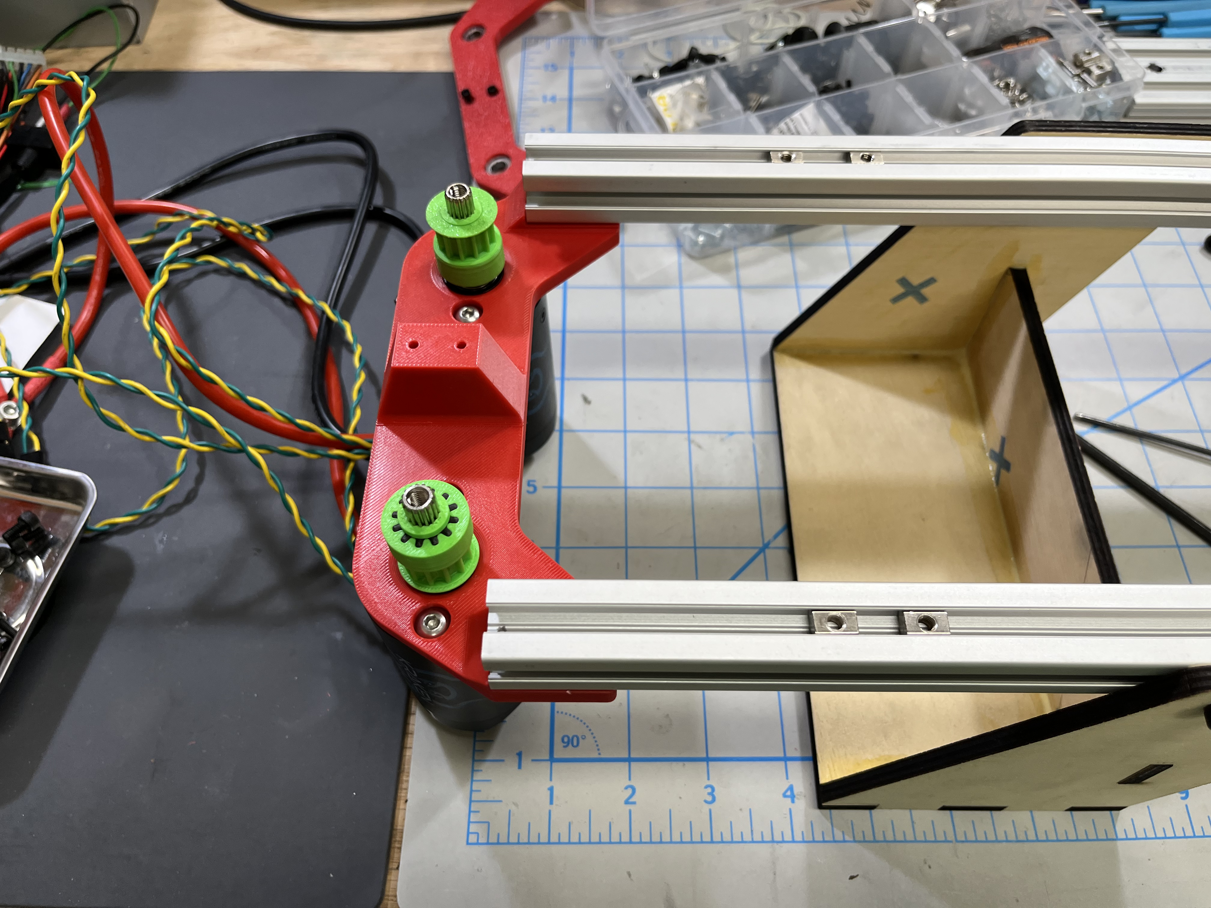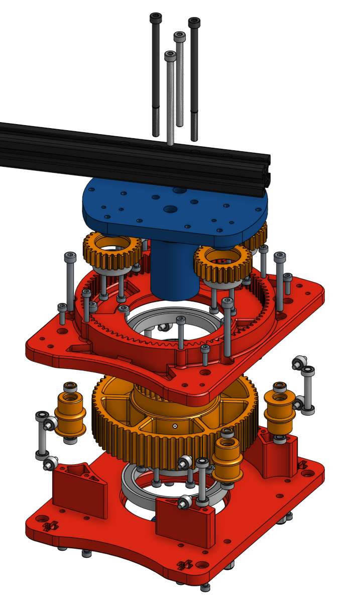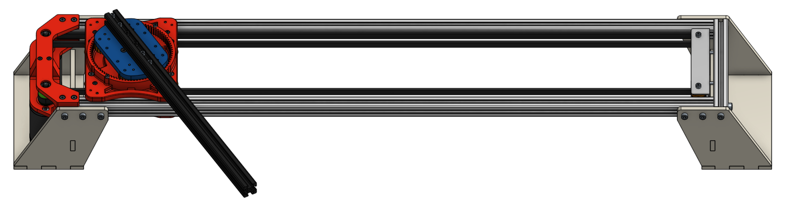 The mechanism is driven by two Kraken X44 brushless motors in a differential configuration where spinning both motors the same direction rotates the arm, and spinning them in opposite directions slides the gantry. This is accomplished with two 2-meter long HTD belts directly driven by the motors. For more rotational torque on the arm, the gantry integrates a low backlash 3D printed single stage planetary gearbox. The slider bearing blocks and ring gear are integrated resulting in a very low part count.